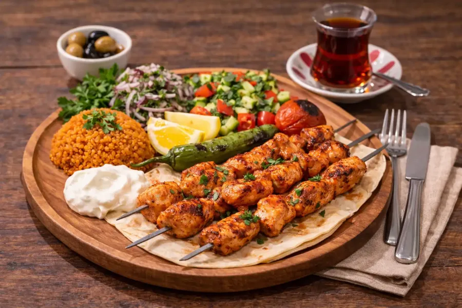 Marine edilmiş tavuk göğsü, renkli biberler ile şişte.